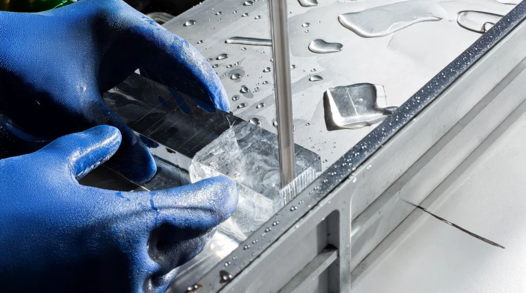 Freezing water into clear ice is inherently energy-intensive, which makes efficiency essential. Rather than increasing energy input to correct imperfections, we focus on freezing methods designed to reduce waste and improve yield from the outset. At the core of our process is direct (directional) freezing, a controlled technique designed to freeze water predominantly from a single direction. As ice forms, air bubbles and remaining impurities are pushed away from the freezing front, resulting in consistent clarity without the need for repeated freezing or corrective processing. This controlled freezing method improves yield by increasing the proportion of usable ice produced in each cycle. As a result, fewer blocks are rejected and fewer re-freeze cycles are required, supporting more efficient electricity use per unit.